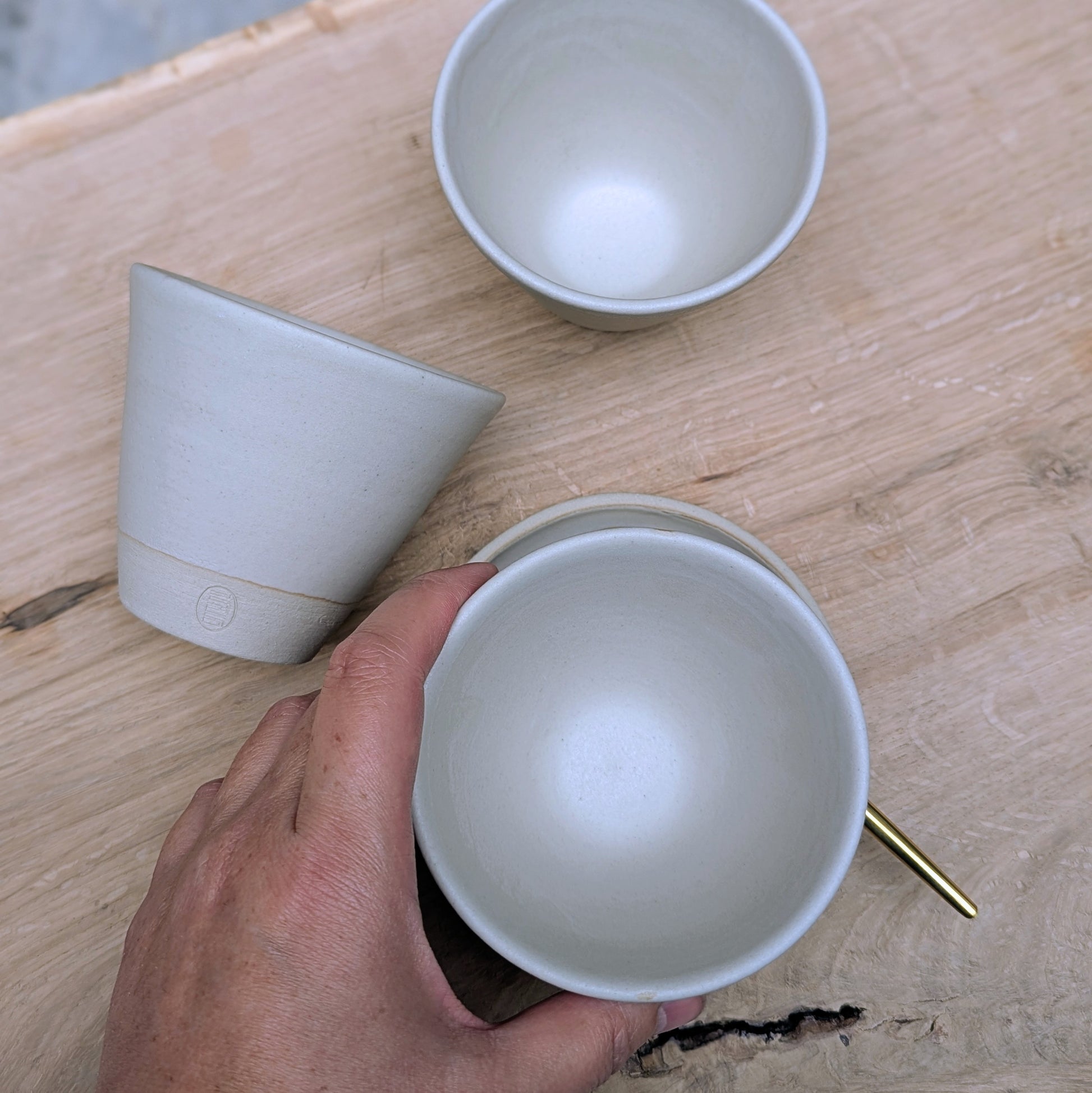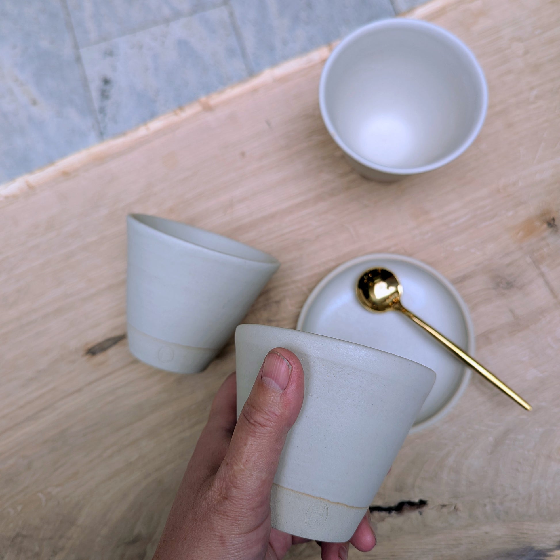 Diese Steinzeug Espresso Becher sind handgemacht, glasiert und zweimal gebrannt.